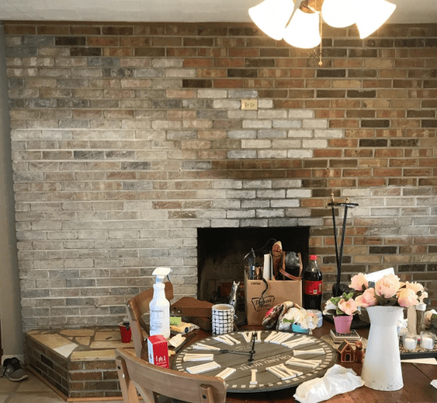 The fireplace was a huge focal point in our kitchen. When you entered through the back, it was right there. The whole wall to the right was the fireplace. It was made of this orange and brown brick like the outside of the house. It was pretty when the kitchen was red, but once we painted the house a cool shade of gray, it was just out of place. I was reading a book on redecorating at the time, and I was convinced it was time to re-do the fireplace (side note: if you’re looking for an excellent book on getting out of a decorating funk or trying to do so on a budget, I HIGHLY recommend “The Nesting Place” by Myquillyn Smith).